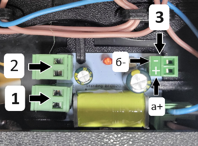 А. И Б. Клемы подключения в зажимные колодки провода кабеля ШВВП 2*0.75, при подключении полярность не имеет значения.